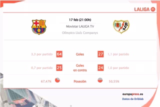En el terreno ofensivo, el conjunto azulgrana tiene mejores números que el equipo vallecano en goles por partido con 2,8 goles por encuentro del primero frente a 1,2 del segundo, según las estadísticas de Driblab consultadas por Europa Press. En cuanto a la calidad de las ocasiones de gol generadas, el equipo catalán también supera a los madrileños con 1,8 goles esperados frente a 1.
