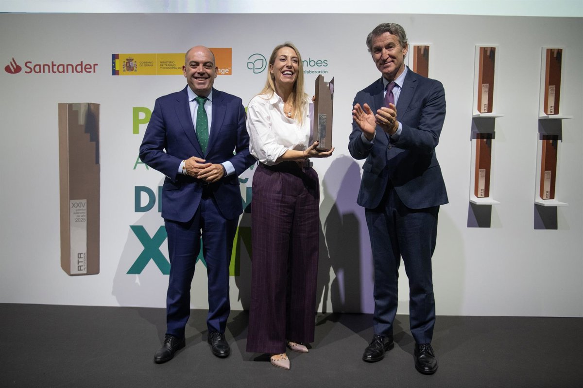 (I-D) El presidente de ATA, Lorenzo Amor; la presidenta de la Junta de Extremadura, María Guardiola, y el presidente del PP, Alberto Núñez Feijóo, durante la gala de los XXIV Premios Autónomo del Año, en el Auditorio Santander, a 27 de octubre de 2025, en - Fernando Sánchez - Europa Press