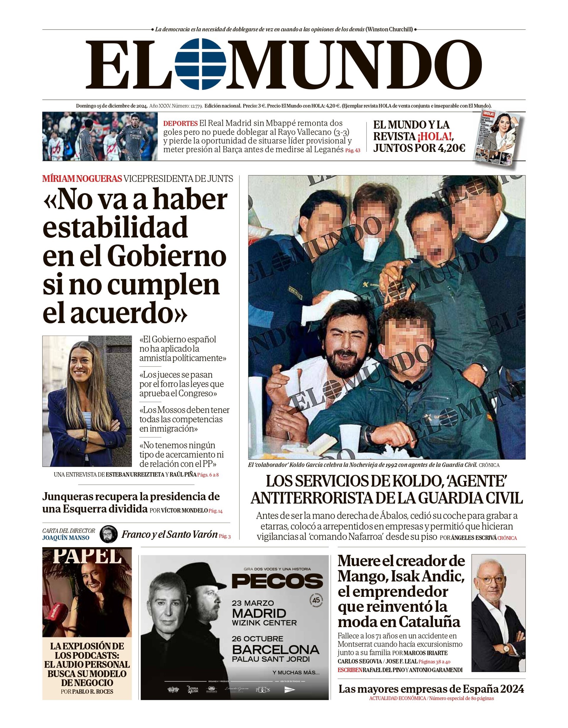 EL MUNDO: Míriam Nogueras, vicepresidenta de Junts: "No va a haber estabilidad en el Gobierno si no cumplen el acuerdo"; "Junqueras recupera la presidencia de una Esquerra dividida"; "Los servicios de Koldo, 'agente' antiterrorista de la Guardia Civil"; "Muere el creador de Mango, Isak Andic, el emprendedor que reinventó la moda en Cataluña".
