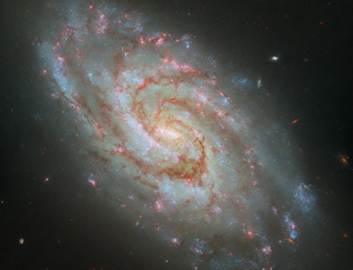 En el corazón de esta galaxia se encuentra una barra luminosa que es flanqueada por brazos espirales majestuosos y adornada con nubes de polvo oscuro. Lo que añade un brillo particular a la imagen son innumerables puntos brillantes de color rosado dispersos a lo largo del disco galáctico, identificados como regiones H-alfa. Estas áreas son cruciales para los astrónomos, ya que representan nebulosas donde tiene lugar la formación de nuevas estrellas, emitiendo una potente luz roja H-alfa. Un grupo de astrónomos plantea la hipótesis de que la llamada "barra" sobre el centro galáctico podría ser, en efecto, una zona de intensa formación estelar.